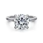 14K White Gold Round Diamond Engagement Ring. This classic solitaire style has 0.14cts hidden halo and diamonds across the bridge that are G-H in color and SI in clarity. The center head fits a 9mm round diamond.