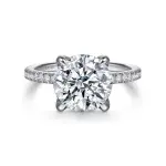 14K White Gold Round Diamond Engagement Ring. This 14K white gold band with 0.23cts accented diamonds down the sides, G-H in color and SI in clarity. The center head fits a 9mm stone.