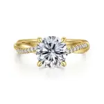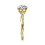14K Yellow Gold Twisted Round Diamond Engagement Ring. This eligant twisted band had one side with smooth 14K yellow gold and the other has 0.16cts diamonds along is. The head fits a 8mm diamond.